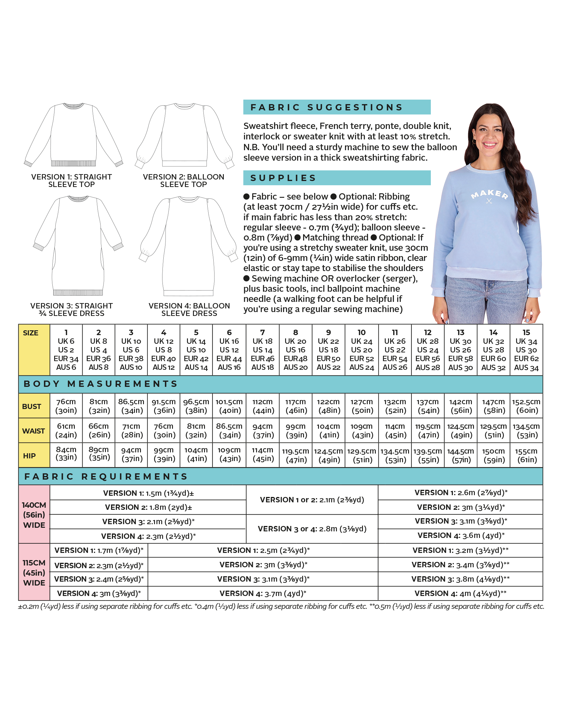 - Optional: Ribbing for cuffs etc, if main fabric has less than 20% stretch: regular sleeve – 0.6m (5/8yd); balloon sleeve – 0.7m (3/4yd)